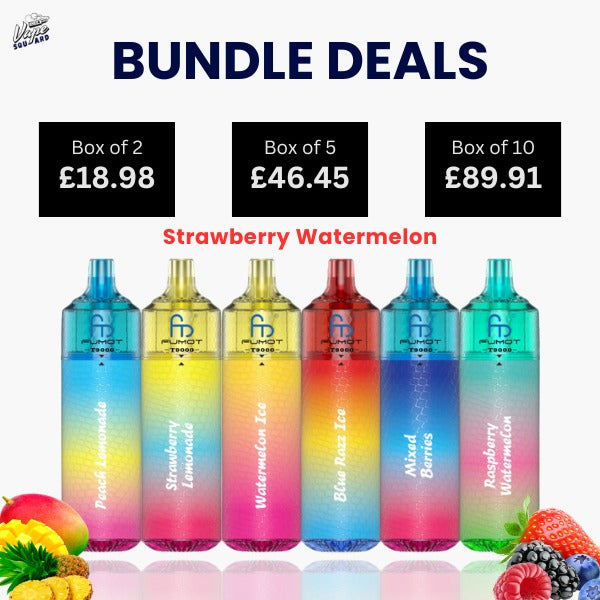 Whether you’re looking for a pick-me-up or simply want to indulge in a classic fruit fusion, the Fumot T9000 Strawberry Watermelon Prefilled Vape delivers all the fruity goodness you crave in a smooth, satisfying experience.