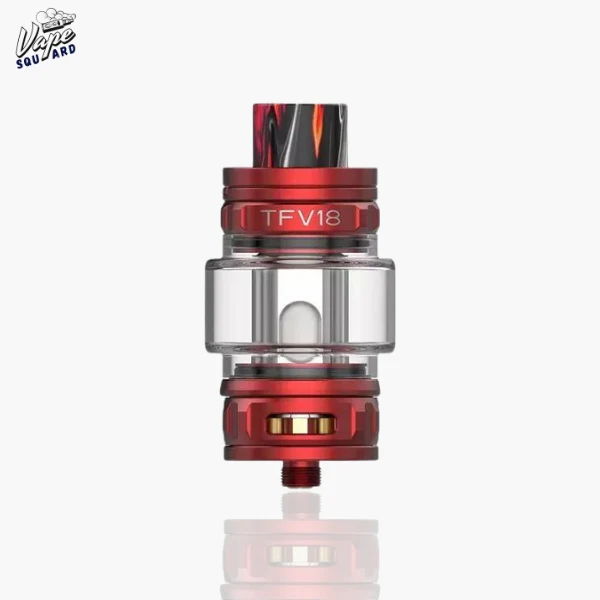 A1- The Red TFV18 Tank stands out with its vibrant color and bold design, making it a stylish and eye-catching choice for vapers who appreciate both aesthetics and performance.